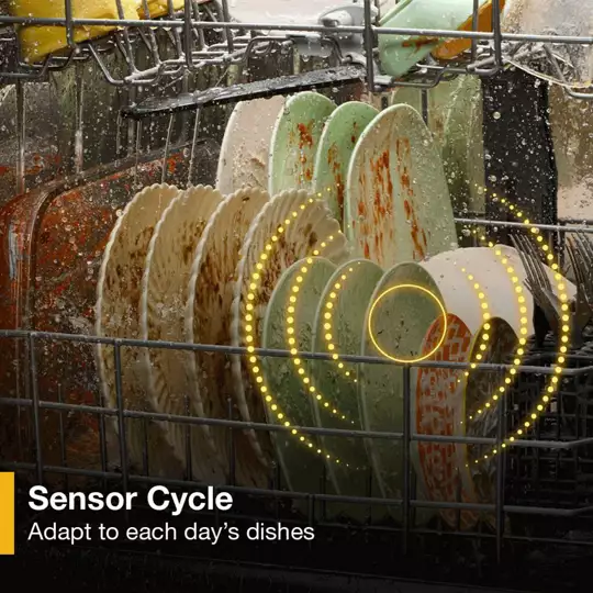 Don’t stress over settings. Sensor Cycle uses an AI Intelligent Wash designed with sensors that adjust wash action based on soil level, load size, and water temperature to ensure your dishes come out clean.