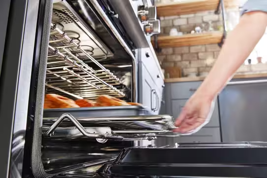 makes it easier to cook with large or heavy bakeware. Sure-grip handle and smooth roll-out simplify loading and unloading.