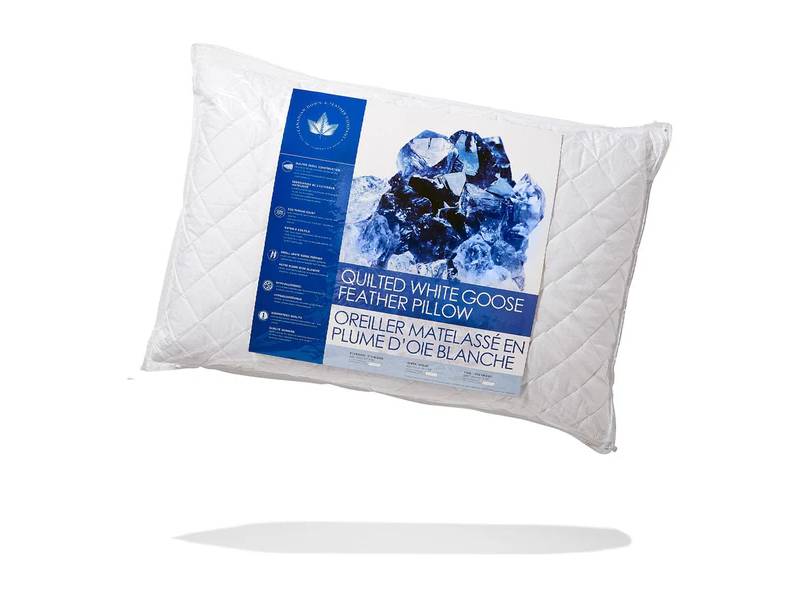 This pillow is filled with care in Canada. The pillow is filled with goose feather. Feathers provide great support in pillows, due to the feather quills. The outer shell is quilted 255 thread count cotton. The quilting results in a thicker, more cushiony shell, which creates a buffer against the feather, making the quills less noticeable than in a traditional feather pillow.