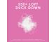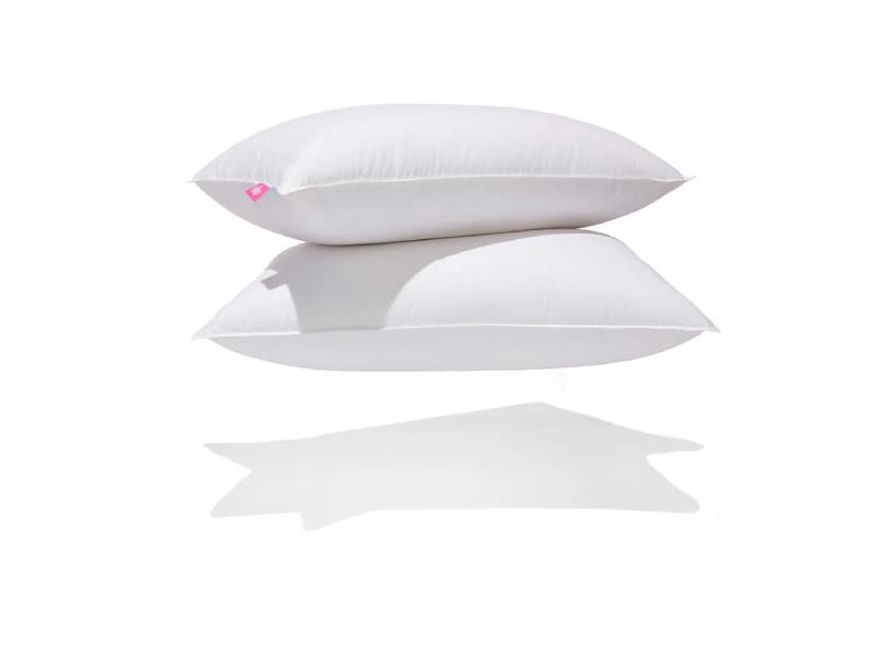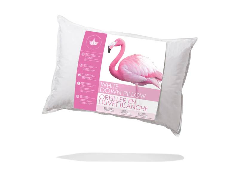 This pillow is filled with care in Canada. The shell is crisp 260 thread count cotton. The fill is 550 loft duck down. Down is made up of tiny, fluffy clusters, so down pillows are very soft, sinky, and squishy.