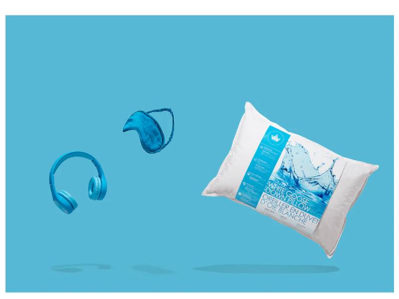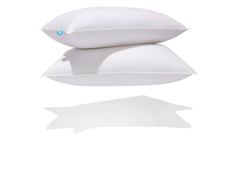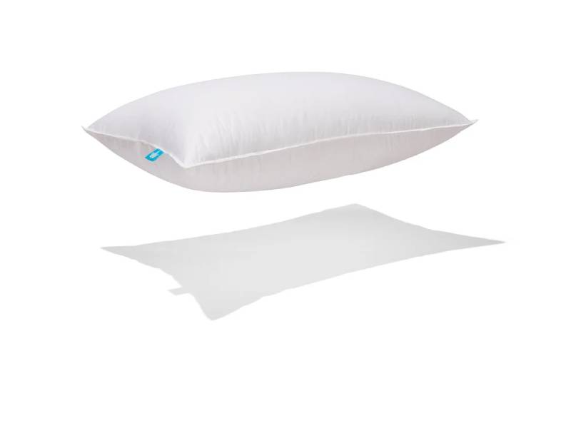 This pillow is filled with care in Canada. The shell is crisp 260 thread count cotton. The fill is 575 loft goose down. Down is made up of tiny, fluffy clusters, so down pillows are very soft, sinky, and squishy.