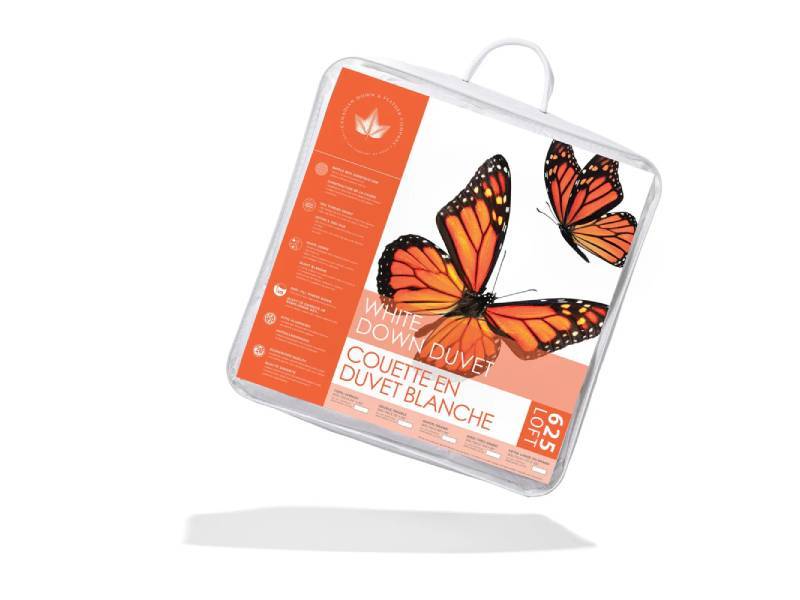 This duvet is filled with care in Canada. The cotton shell is 360 thread count, so it is soft and quiet. The duvet is filled with 625 loft duck down. Down fill is soft and luxurious, made up of tiny, fluffy clusters. This duvet is fairly lightweight, but you'll find this duvet contains more fill than a duvet with higher loft down (700 or 850). This is because the higher the loft of the down, the better the insulating properties, and the less of it we need to achieve the desired warmth level! Conversely, you'll find it has less fill than a duvet with lower loft down (550 or 575).