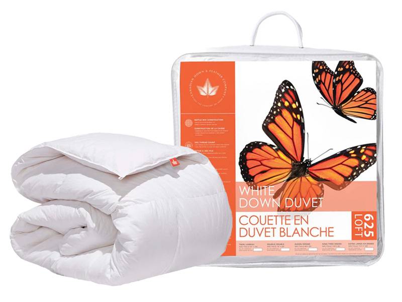 This duvet is filled with care in Canada. The cotton shell is 360 thread count, so it is soft and quiet. The duvet is filled with 625 loft duck down. Down fill is soft and luxurious, made up of tiny, fluffy clusters. This duvet is fairly lightweight, but you'll find this duvet contains more fill than a duvet with higher loft down (700 or 850). This is because the higher the loft of the down, the better the insulating properties, and the less of it we need to achieve the desired warmth level! Conversely, you'll find it has less fill than a duvet with lower loft down (550 or 575).