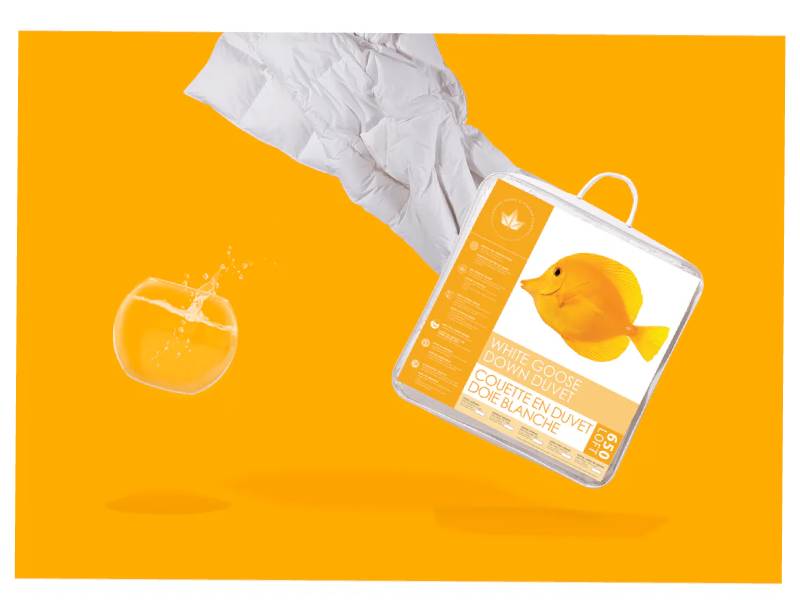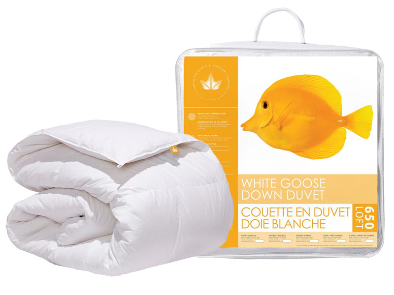 This duvet is filled with care in Canada. The cotton shell is 360 thread count, so it is soft and quiet. The duvet is filled with 650 loft goose down. Down fill is soft and luxurious, made up of tiny, fluffy clusters. This duvet is fairly lightweight, but you'll find this duvet contains more fill than a duvet with 700 or 850 loft down. This is because the higher the loft of the down, the better the insulating properties, and the less of it we need to achieve the desired warmth level! Conversely, you'll find it has less fill than a duvet with 550 or 575 loft down.