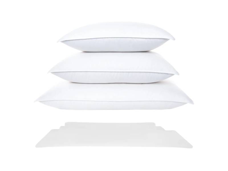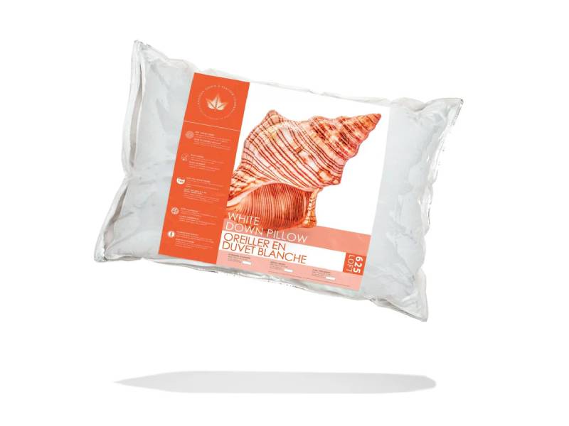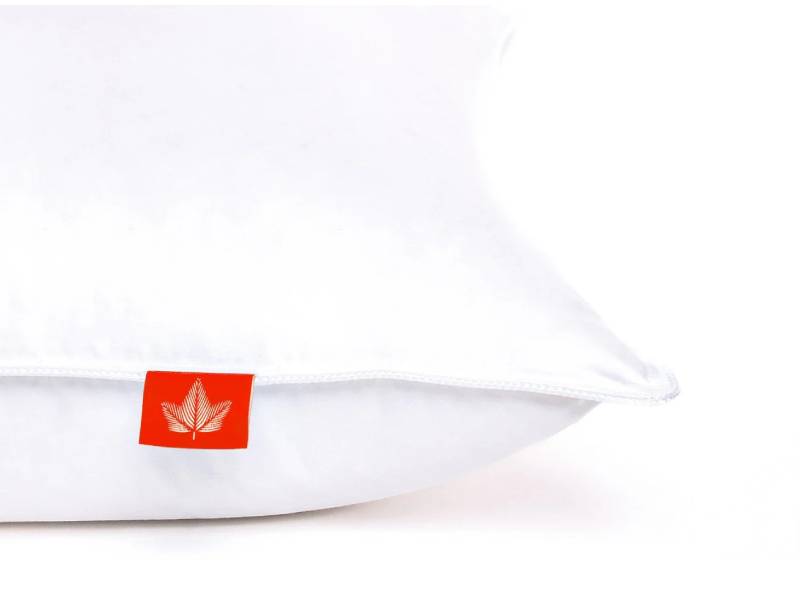 This pillow is filled with care in Canada. The shell is crisp 260 thread count cotton. The fill is 550 loft duck down. Down is made up of tiny, fluffy clusters, so down pillows are very soft, sinky, and squishy.