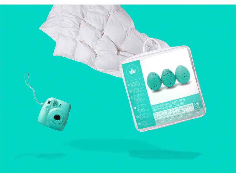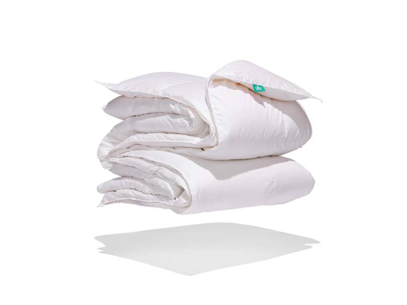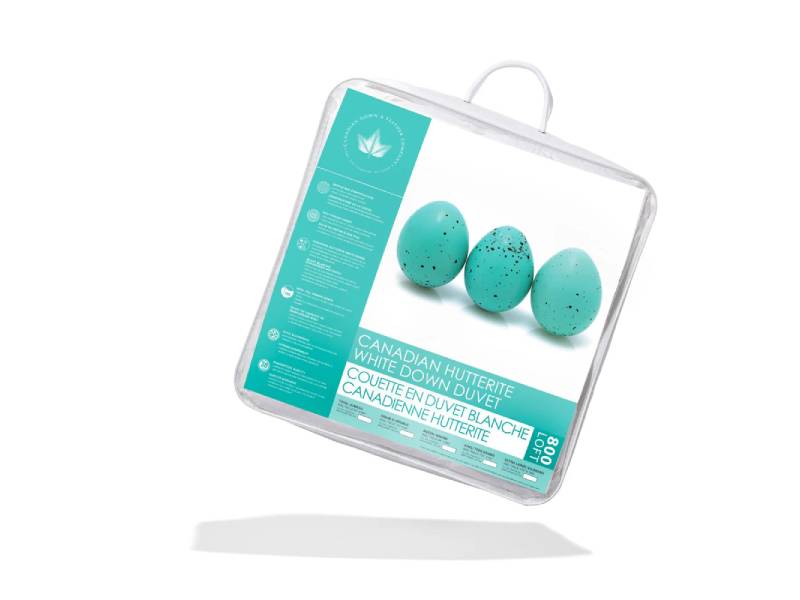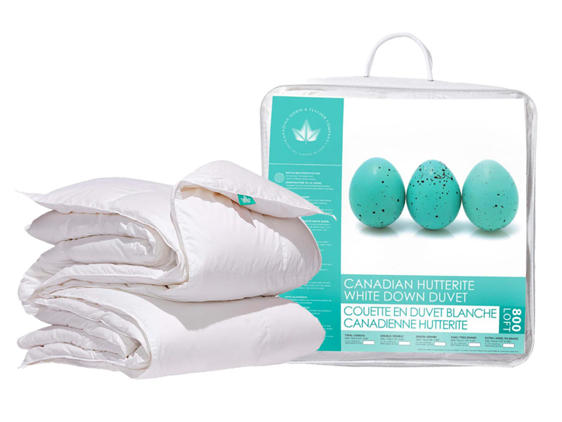 This duvet is made with care in Canada with Canadian fill. The shell is 500 thread count cotton – soft and quiet. The shell is filled with 800 loft duck down farmed by Hutterites in Alberta, Canada. Down fill is soft and luxurious, made up of tiny, fluffy clusters. The fill is very high loft, which means it is high quality and very warm per ounce. This is why you’ll find this duvet is very lightweight. Just a little bit of fill goes a long way in terms of warmth!