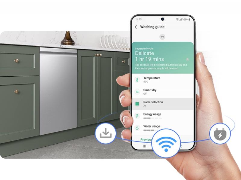Improve how you use the dishwasher to suit your lifestyle. The SmartThings App* lets you remotely monitor and control it on a smartphone. It also suggests washing types and modes to use based on how you cook**, while helping you monitor energy use, manage consumables*** and diagnose and resolve errors.
