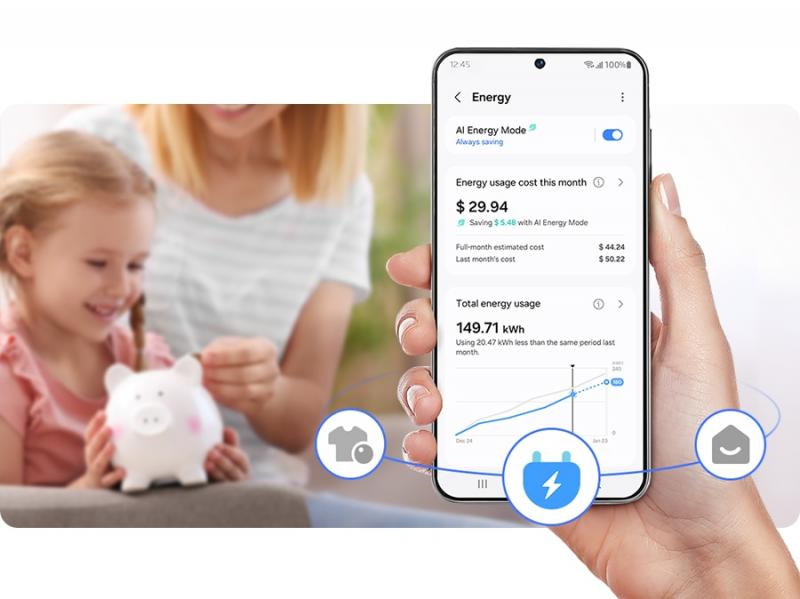 * Available on Android and iOS devices. A Wi-Fi connection and a Samsung account are required. ** Based on internal testing on a DW90F89****** model to measure the energy consumption of the Auto program with and without using AI Energy mode, in accordance with the AHAM DW-1-2020 and AHAM DW-2-2020 standards. Result: Auto program = 724Wh and Auto program with AI Energy mode = 470Wh, which is a reduction of 35%. Results may vary depending on the actual usage conditions. AI Energy mode can be used with 6 washing cycles: Intensive, Express, Extra Silence, Pots & Pans, Plastic and Auto.