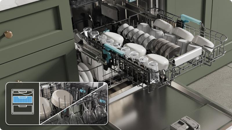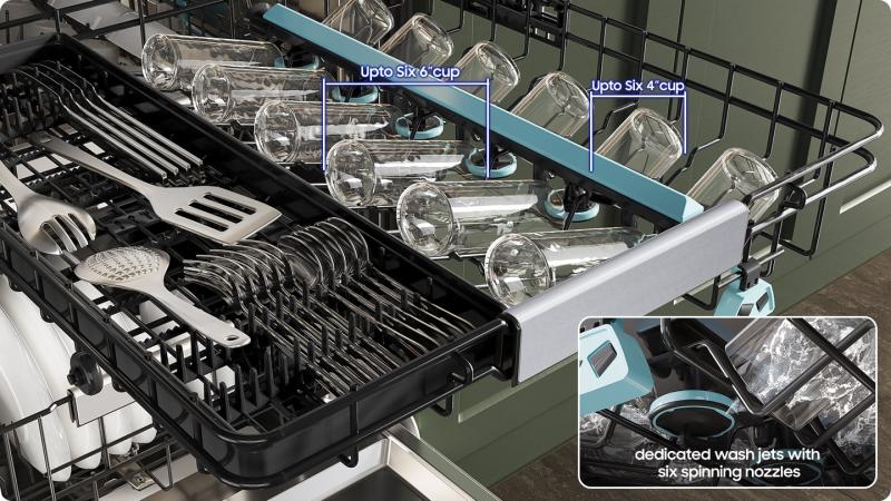 Clean cutlery, utensils and drinkware easily, effortlessly and space efficiently*. An upgraded 3rd Rack washing system is a dedicated area to put cutlery and utensils. There is also an area to put drinkware, which has dedicated wash jets with six spinning nozzles that remove residue.