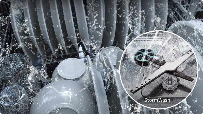 Clean heavily soiled pots, pans and dishes. StormWash+™ delivers an intensive washing performance. A circle-shaped spray jet covers a larger area* and blasts water from many angles**. A new Pan holder enhances the power of the washing jet. And two washing arms help wash quickly and effectively.
