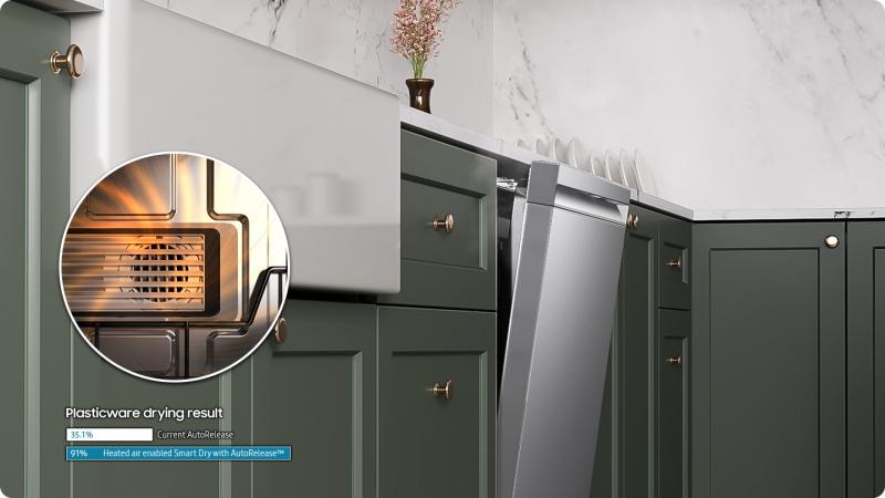 Dry dishes with heated air enabled Smart Heat Dry with AutoRelease™. It absorbs moisture and circulates high temperature air at 212ºF, so it delivers powerful drying performance. Also, when cycles end, the door opens automatically to let steam escape, enabling fast and easy drying.