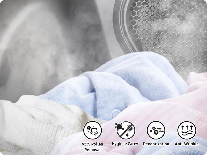 Refresh clothes and other laundry items, like linen, baby clothes and soft toys. The Steam Sanitize+ cycle infuses high temperature heat deep into the fabric of wet items* and injects steam during the drying cycle, So it thoroughly refreshes your laundry. 5