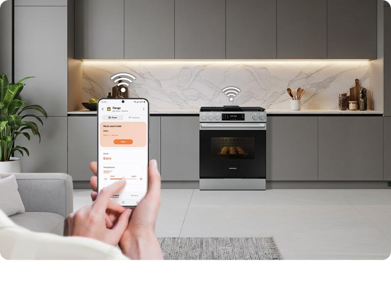 Enjoy added convenience and peace of mind with embedded Wi-Fi. The SmartThings App* lets you monitor and control the oven anywhere using a smartphone. You can check and adjust settings and receive alerts. You can also control it with your voice using a voice assistant**, like Samsung Bixby***.