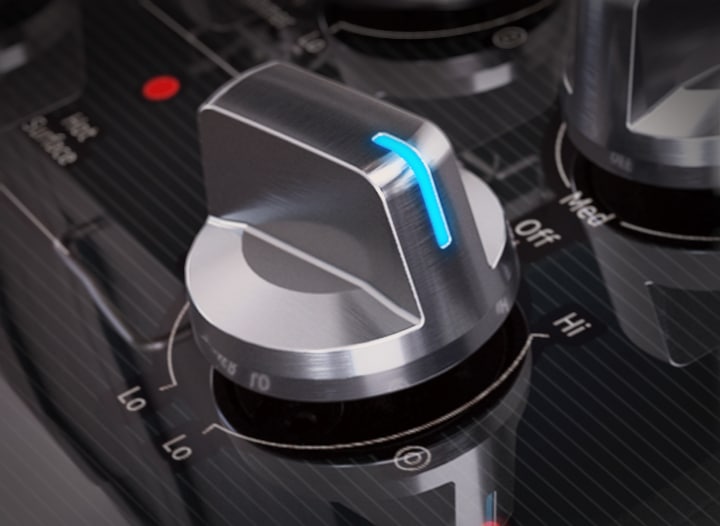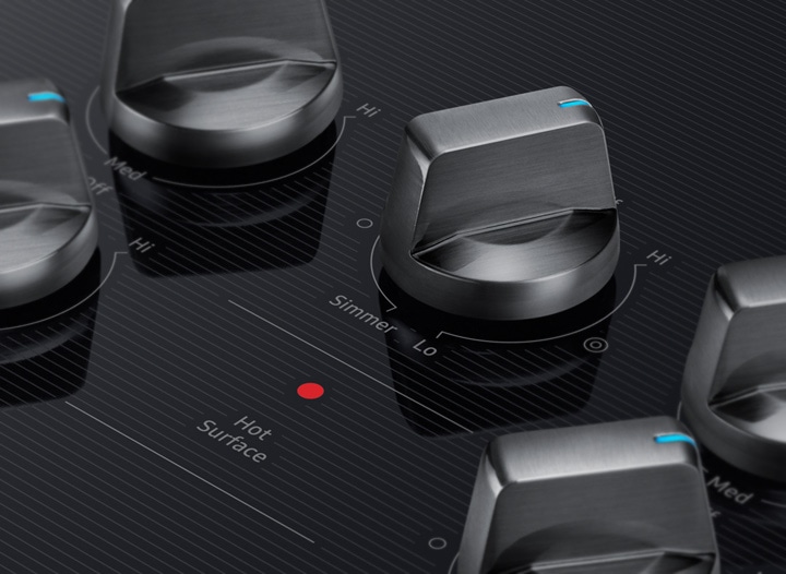 Its illuminated metallic knobs are easy to grip, but electronically adjust the heat, so you can control the burners precisely and intuitively. And ice blue lighting shows if a burner is on and gives a premium look.