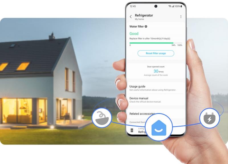 Take care of your refrigerator more easily. SmartThings Home Care* provides real-time monitoring and alerts. You can check on its status, including the condition of the water filter. It also automatically notifies you if parts need replacing or problems are detected, and suggests a solution.2